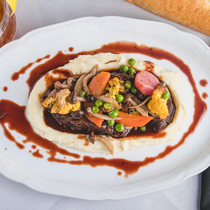 5-hour braised beef short ribs, vegetables, mashed potatoes, Bordelaise