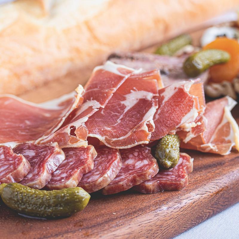 imported cheeses, cured meats, homemade pâté, cornichons